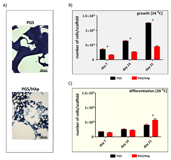 Optical microscopic images of May–Grunwald–Giemsa stained sections of the PGS and PGS/HAp scaffolds populated by hFOB 1.19 pre-osteoblasts in 7-day cell cultures (A). The nuclei of the cells appeared deep purple with light purple surroundings. The proliferation of human osteoblasts in the PGS and PGS/HAp scaffolds (B) under conditions permitting proliferation (34 °C) and (C) in the osteogenic conditions (39 °C) followed for up to 21 days of culture. The results are shown as the mean values ± SD. * p < 0.05 between the PGS and PGS/HAp composites, with the Mann–Whitney U test used to assess the statistical significance for the observed changes.
