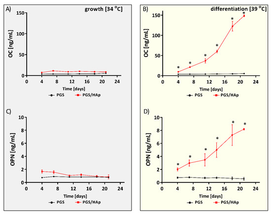 The biomarkers of bone turnover are involved in the processes of bone metabolism and remodeling, including bone formation and bone resorption. Osteocalcin (OC), produced by osteoblasts, plays a role in metabolic regulation and bone mineralization, while osteopontin (OPN) is one of the major bone resorption biomarkers [54,55]. Osteogenic markers produced during the hFOB 1.19 differentiation, including OC and OPN, were detected in the supernatants collected on days 4, 7, 11, 14, 18 and 21 of osteoblast culture on the PGS and PGS/HAp scaffolds (Figure 10). Under culture conditions supporting cell proliferation (34 °C), the concentration of OC was similar at every time point, and its production was not affected by HAp. The level of OC produced by hFOB 1.19 on the PGS scaffold was 3.5 ± 1.7 ng/mL on day 4 and reached 5.4 ± 0.1 ng/mL on day 21. The levels of OC produced by the cells grown on the PGS/HAp composites were 7.2 ± 1.5 ng/mL on day 4 and reached 8.7 ± 1.3 ng/mL on day 21. Interestingly, when hFOB1.19 cells were cultured in an osteogenic environment (39 °C), the concentration of OC continued to accumulate on biomaterials enriched with HAp. Irrespective of the culturing temperature and the addition of osteogenic agents, the levels of OC remained unchanged throughout the experiment when cells were cultured in the absence of HAp. The levels of OC produced on the PGS/HAp composites were over one order of magnitude higher than those detected in cultures incubated in the absence of HAp, for which the OC production remained at the background level. The respective levels of OC produced in the presence of HAp compared to the OC production by osteoblasts cultured on unmodified PGS composites were 9.5 ± 2.5 ng/mL and 7.2 ± 1.5 ng/mL, p = 0.04 on day 4 and 148.5 ± 3.3 ng/mL and 8.7 ± 1.3 ng/mL, p = 0.01 on day 21.