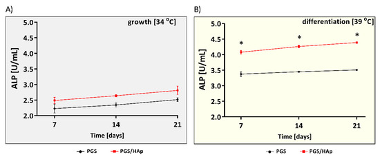 Alkaline phosphatase (ALP) activity in cell lysates obtained from hFOB1.19 cells cultured at 34 °C (A) or in the osteoinductive environment at 39 °C (B). The results represent the mean ALP activity ± SD. * p < 0.05 between the PGS and PGS/HAp composites, based on the results of the Mann–Whitney U test.