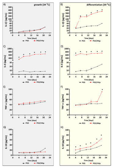 In contrast, cells cultured at 34 °C produced less IL-10, and the concentration of this cytokine remained similar throughout the entire experiment. While the trend in production of IL-10 was generally not related to the composition of the scaffold, the PGS/HAp scaffolds stimulated higher IL-10 production on day 21. The level of IL-10 produced by hFOB 1.19 on the PGS scaffold was 9.6 ± 3.3 pg/mL on day 4 and reached 26.8 ± 1.0 pg/mL on day 21. In the case of PGS/HAp composites, it was 10.6 ± 0.5 pg/mL on day 4 and 12.8 ± 0.5 pg/mL on day 21 (Figure 12G,H).