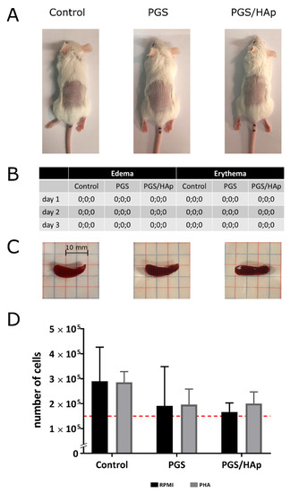 Biocompatibility testing of nonpolar extracts obtained from the PGS and PGS/HAp scaffolds. BALB/c mice were monitored following subcutaneous injections of PGS and PGS/HAp extracts or physiological saline for 72 h to screen for adverse reactions (A). The appearance of edema and erythema was assessed and graded daily according to the Primary Irritation Index (PII) = 0/3, where 0 indicates that the irritation is negligible (B). At 72 h post-injection, the animals were terminated and spleens (C) along with blood, samples and other critical organs were collected and inspected. Splenic lymphocytes were next isolated, and their proliferation rates were measured in the presence or absence of a mitogen—PHA (D) with a CyQUANT assay.