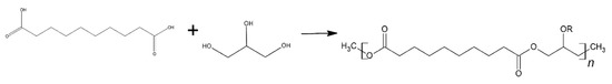Sebacic acid was heated with glycerol to 130 °C and stirred mechanically. After the monomers were combined, the reaction was continued for 24 h and quenched by lowering the temperature to 25 °C, and its product was stored for further use. The reaction scheme is shown in Figure 14.