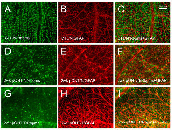Loss of RGCs and glial reactivity two weeks after pONT. Double immunohistochemistry of RBPMS and GFAP was performed on retinal wholemounts. Compared to the contralateral control (A–C), noticeable dropout of RGCs was detected and reactive astrocytes were present in the nasal quadrant after pONT (D–F). A more dramatic loss of RGCs and increased astrocytic reactivity were noted in the temporal quadrant after pONT (G–I). N = nasal; T = temporal; RBPMS = RNA binding protein with multiple splicing; GFAP = glial fibrillary acidic protein; 2 wk = 2 weeks; pONT = partial optic nerve transection; CTL = control.