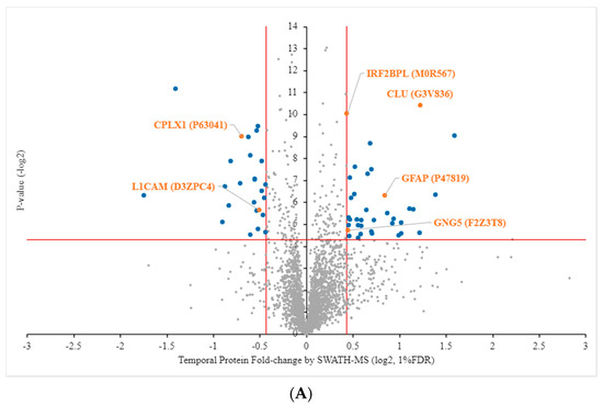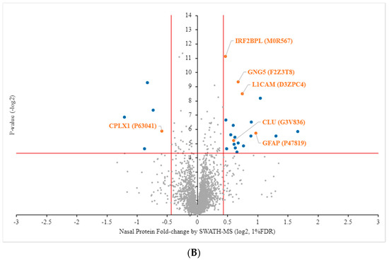 Volcano plot of proteins quantified using SWATH-MS. A plot of protein fold-change (log2, x-axis) and p-values (-log2, y-axis). Significantly differentiated unique proteins in quadrant positions (blue) and shared proteins (orange) were determined by p-values < 0.05, fold-change log2 > 0.43 (up-regulation) or ≤ −0.43 (down-regulation) and a 1% false discovery rate (FDR). (A) Left temporal (LT) compared to right temporal (RT). (B) Left nasal (LN) compared to right nasal (RN). Names of shared proteins are shown.
