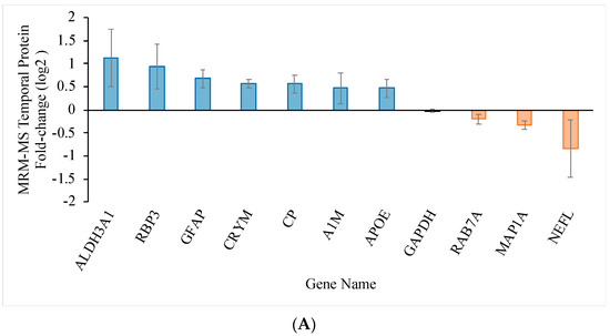 Target proteins were filtered with the following criteria: amino acid length between 8–25 units, unique peptide sequence, excluding peptides with structural modifications and missed tryptic cleavage. Proteins with less than three signature peptide sequences were not considered. The high-quality peptide transitions were further refined with retention linear regression, r > 0.95, and a similarity score, dotp > 0.9. The MRM data were analyzed with Skyline and MultiQuantTM (version 3.03, Sciex). The raw data were searched against the corresponding protein FASTA sequence and matched with a previously acquired TOF-MS spectral library. The MRM transition quality was determined using the dotp score of the peak area and retention time. The MRM raw data were further processed using the MultiQuantTM software and the MQ4 algorithm for automatic peak integration and the resulting retention time, peak area, peak height and signal-to-noise ratio for each monitored ion transition. The weighted average analysis was performed as previously reported [57]. In brief, peaks were normalized by calculating the peak area for each transition relative to the peak area of GAPDH transition. The transition response was calculated from the average of the three technical replicates of individual biological samples and type (treatment, control). The transition weighted average was calculated respective to the weight = 0 for S/N ratio < 5 and weight = 1 for S/N ratio ≥ 20. A Sigmoid distribution was applied to the intermediate S/N value. The weighted fold change for peptides was calculated as the weighted average of its transitions. The weighted fold change for proteins was further calculated as a weighted average of the corresponding individual peptides. The reported standard deviation was calculated based on the weighted average protein fold changes of individual biological samples. A Welch’s t-test (unequal variances t-test) p-value < 0.05 was considered statistically significant in all cases. The experimental design is shown in Figure 2.