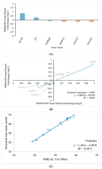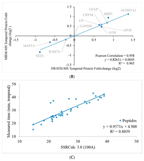 Relationship between protein quantification using SWATH-MS and targeted MRM-MS approaches in the temporal retinal quadrant two weeks after pONT. (A) Significantly differentiated retinal proteome in the temporal quadrant after pONT compared to control. The bar chart shows the average protein fold change with standard deviation (n = 4, p < 0.05, 1% FDR). (B) The retinal proteome fold-change correlation in the temporal quadrant 2 weeks after pONT treatment, measured using independent MRM-MS and SWATH-MS experiments with high regression (R2 = 0.965) and Pearson’s correlation (R2 = 0.958) on differentially expressed proteome. GAPDH was included as a reference. (C) Retention time linear regression plot of total 99 MRM transitions, governing 33 peptides used for the identification and fold-change calculation of 11 temporal proteins (n = 4, in triplicate).