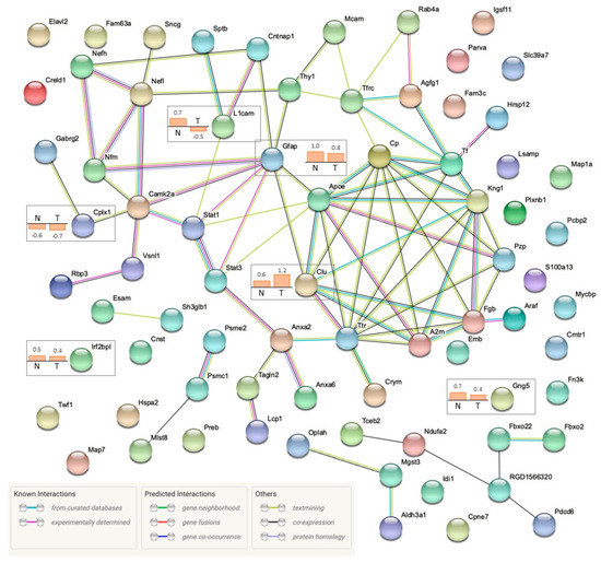 Protein–protein interaction analysis of regulated proteins two weeks after pONT with STRING database (STRING, version 11.0). A total of 80 non-redundant, significantly differentiated proteins from the nasal or temporal quadrants were converted to 75 matched gene IDs from UniProt accession numbers using the Uniprot database. Protein–protein interaction network was executed with “Rattus norvegicus” as the selected organism. Shared proteins (n = 6) are highlighted with their fold change (log2) determined by SWATH-MS.