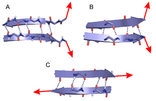 Previous results on these motifs helped in understanding their stability and dynamics during folding or structure disrupting events [15,16,17,18]. Molecular dynamics (MD) simulations, together with single-molecule force microscopy, studied the formation and break-up of H-bonds as a function of the pulling direction [19] and the composition of the solution matrix [20]. The picture is complex as there are several challenging problems for quantitative atomic level description, including the limited accuracy of force fields for describing H-bonded systems [21,22]. However, due to their structural degree of freedom, β-sheet motifs are suitable for QM calculations [23,24,25]. These calculations are increasingly observed in such studies as they can provide an accurate description of the energetics during a step-by-step investigation of dynamic processes and can also readily employ implicit solvent models with diverse bulk conditions [26,27,28].