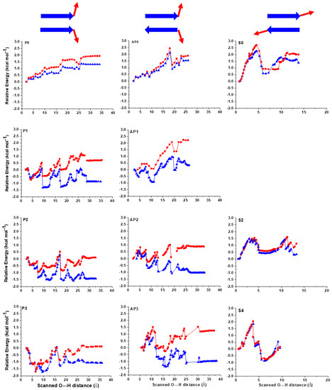 Our previous results [23] regarding the mechanism of lateral unfolding showed that, in parallel β-sheet models, the water molecules keep moving toward the interior of the sheet where the remaining H-bonds are still connecting the two strands. These water molecules form H-bonds with the bridge atoms of peptide–peptide H-bonds that are about to break up, aiding their separation (Figure S2). For antiparallel models, this type of ‘water-walking’ can be observed only when a sufficient number of water molecules are present, i.e., for the model with three H2O molecules [23].