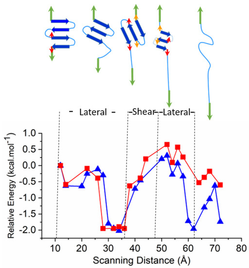 In order to compare changes in mechanism and relative energies, a larger β-sheet model (3Turn) was also investigated. This model consists of a total of 22 residues and its unfolding was tested in both W and LP environments. In order to facilitate comparison, the length of the β-strands was chosen to match the models used for sheared unfold. Similarly to the smaller models, nine water molecules are present in 3Turn which enter between the strands and mediate the process of unfolding. However, for this large model the entire unfolding process can also be separated into lateral- and sheared unfolding periods. The initial phase consists of the lateral unfolding of the last strand on the N-terminal (Figure 3). Once the unfolded N-terminal is stretched, the relative position of the two pulling directions becomes such that the process changes to sheared unfolding, with all remaining β-strands involved. This results in a rapid increase in energy, and the ‘melting’ of the structure with the inter-strand H-bonds is shifted, and the sheared process finally results in a shorter β-sheet (Figure 3 and Figure S3). Next, the unfolding mechanism switches back to lateral and involves all strands. Finally, the sheet motif collapses into mainly stretched regions, where the individual amino acids first adopt turn-like γL [41] conformations on the Ramachandran Map; finally, they are stretched into extended βL conformations.