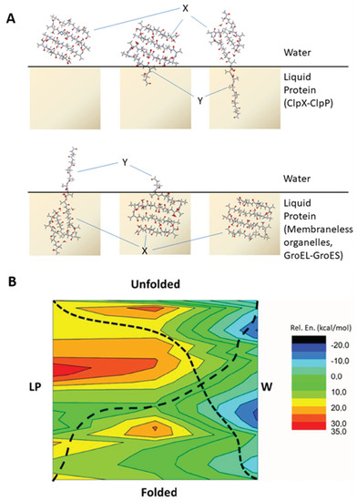 Based on the QM calculations presented, it is clear that aqueous and liquid–protein environments have a strong effect on the folding properties and affinity of protein and peptide segments. The present investigation provides insight at the atomic-level to structural and energetic properties of the mechanical unfolding of small peptide models under the influence of two bulk environments: the aqueous (W) and a membrane-like liquid protein phase (LP) (Figure 4A). Our results demonstrate that the structural water molecules present on the studied peptide motifs are crucial in aiding unfolding, keeping partially unfolded peptide strands connected via H-bonds formed between bridge water molecules and the peptide backbone; however, they also render the folding/unfolding energetics sensitive to molecular environments. The water-aided lateral unfolding of both parallel and antiparallel β-sheet models showed that the unfolding event is favored in W, but it is highly disfavored in an LP-like molecular environment. The calculations indicate that the average stabilization in W relative to LP can be as high as ~2.2 kcal·mol−1 per amino acid in case of the unfolding of antiparallel motifs. This significant value also explains why disordered sequences have high tendency to become folded in environments similar to the LP phase that is in lipid bilayers, in protein cores or in the liquid protein phase of membraneless organelles. In contrast to lateral unfolding, the longitudinal or sheared unfolding direction induces much higher energetic barriers for the process, but a less sensitive environment dependency. These conclusions were fully supported by following the unfolding of a larger model, where both lateral and sheared directions are present (for clarity, see Video S1 in Supplementary Material). Isodesmic reactions provided insight into energetic aspects of how phase change from W to LP can have a very significant effect on the overall stability and 3D structure of most proteins. Based on these, a schematic energy surface of the unfolding process coupled to phase transition was obtained (Figure 4B). The latter provides a quick qualitative interpretation on the effect of phase transfer on the folding or unfolding preference of sheet motifs. We hope that our investigations not only help in better understanding the LP phase of membraneless organelles and the lipophilic interior of biomembranes but also provide quantitative information on why an inner separated hydrophobic region is required for chaperones to drive protein folding more effectively. Furthermore, the obtained results on energetic properties of the peptide backbone can also be relevant in other phenomena related to phase transition, such as the interaction between disordered membrane-active peptides and lipid bilayers.
