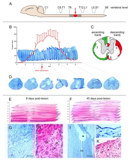 Anatomical analysis of the contusion model used in this study. (A) The epicenter of the impact (red) and the sampled area (dashed) are indicated. (B) 3D representation and quantitative evaluation of the lesion at 45 days post lesion (DPL), as performed in toluidine blue stained coronal sections. (C) Schematic representation of ascending (green) and descending (red) tracts in the Spinal Cord at T9. The numbers refer to the tracts, as follow: 1 dorsal column; 2 spinocerebellar; 3 spinothalamic; 4 corticospinal; 5 rubrospinal; 6 vestibulospinal; 7 reticulospinal; 8 raphespinal, (D) representative coronal sections all along the sampled rostro-caudal extension obtained from a sample animal. (E,F) 3D representation of the lesion d segments, as performed by HE staining on horizontal section at 8 (E) and 45 (F) DPL. (G–K) high power micrographs of the lesioned areas, illustrating the severe inflammatory cellular infiltrate (G) also enriched by gitter cells (marked by black arrows in (H)) at 8 DPL; the cavitation communication with the central canal (marked by * in (I)), respective ependymal-like lining layer (J), and persistence of the inflammatory cellular infiltrate (K) at 45 DPL. Bars: G 100 µm; I 25 µm; K 250 µm; J, K 200 µm.