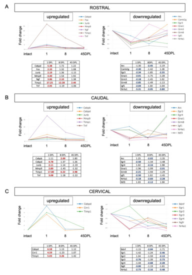 We first analyzed the SC rostral and caudal to the lesion, and a distal cervical segment. Results are presented in Figure 3, were each graph reports the FC at different time-points (DPL), with their numeric values in tables. In the rostral segment, seven genes (Cebpd, Fos, Junb, Mmp9, Ngf, Timp1, Tnf) resulted upregulated at 8 DPL, and only Timp1 remains upregulated at 45 DPL. Seven genes (Camkg2, Egr3, Gnai1, Grm3, Grm8, Igf1, Nr4a1) were downregulated at 1 DPL, and Nr4a1 and Egr3 remain downregulated at 45 DPL. In the portion of the SC caudal to the lesion, six genes resulted upregulated (Cebpb, Cebpd, Junb, Mmp9, Timp1, Tnf) with only Timp1 overexpressed at all considered times points. The downregulated genes resulted differentially distributed across the considered times, with Egr3, Grm8 and Igf1 emerged at 1 DPL; Arc, Egr4, Ntf3 at 8 DPL; Gnai1 at 45 DPL and only Nr4a1 downregulated at all the considered DPLs.