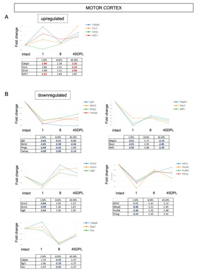 (A,B) Time course expression of upregulated (A) and downregulated (B) genes in motor cortex. Relative gene expression is shown as Fold Change (FC) normalized on motor cortex from intact animals. Only genes with FC ≥ 2 are included in the figure.