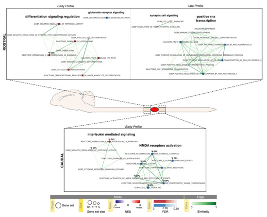 Time-series Gene Set Enrichment Analysis (GSEA) of Spinal Cord (SC) rostral and caudal segments visualized using Enrichment Map Cytoscape App. Results with absolute Normalized Enrichment Score (NES) ≥ 1.5 and False Discovery Rate (FDR) ≤ 0.1 are reported (SC rostral early 1–8 DPL and late 45 DPL profiles, Table 1; SC caudal early 1–8 DPL profiles, Table 2); pathways with FDR ≤ 0.05 are highlighted. Temporal profiles are labeled as Early Profile (peak at 1 DPL) and Late Profile (peak at 45 DPL); 8 DPL pathway enrichments (FDR ≤ 0.05) are individually marked (* 8 DPL). Pathways (circles) are connected by edges (lines) based on their similarity score and grouped into labeled clusters using AutoAnnotate application v.1.3.4. Red dots denote positively associated pathways (enriched respect to control, NES ≥ 1.5) and blue dots denote negatively associated pathways (decreased respect to control, NES ≤ −1.5). Edge width denotes overlap between pathways.