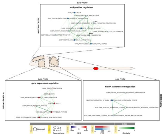 Time-series Gene Set Enrichment Analysis (GSEA) of cerebral Motor Cortex (CTX-M), Basal Ganglia (BG) and Cerebellum (CB) visualized using EnrichmentMap Cytoscape App. Results with absolute Normalized Enrichment Score (NES) ≥ 1.5 and False Discovery Rate (FDR) ≤ 0.1 are reported (CTX-M early 1–8 DPL profiles, and late 45 DPL profile, Table 3; BG late 45 DPL profile, Table 4; CB early 8 DPL, and late 45 DPL profiles Table 5); pathways with FDR ≤ 0.05 are highlighted. Temporal profiles are labeled as Early Profile (peak at 1 DPL) and Late Profile (peak at 45 DPL); 8 DPL pathway enrichments are individually marked. Pathways (circles) are connected by edges (lines) based on their similarity score and grouped into labeled clusters using AutoAnnotate application v.1.3.4. Red dots denote positively associated pathways (enriched respect to control, NES ≥ 1.5) and blue dots denote negatively associated pathways (decreased respect to control, NES ≤ −1.5). Edge width denotes overlap between pathways.