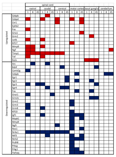 When considering the cervical SC, that is relatively far from the lesion site, three genes resulted upregulated at 1 DPL (Cebpd, Cnr1 and Timp1), being Timp1 still overexpressed at 8, but not at 45 DPL. Few genes resulted downregulated early from the lesion (1 and 8 DPL), including Bdnf, Egr3, Egr4, Ngfr, Nr4a1 and five genes (Egr1, Egr2, Egr3, Egr4, Nr4a1) are downregulated at long time (45 DPL).