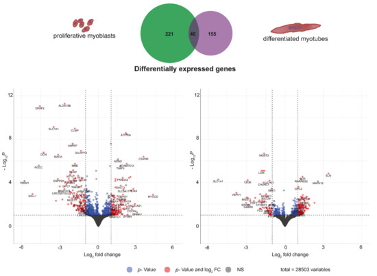 First, DM1 samples were investigated for the typical DM1 phenotype. Cells of all DM1 tissue cultures did show nuclear MBNL1 foci (Figure S1A) and DMPK was slightly upregulated in myoblasts as well as myotubes (Figure S1B). To investigate differential expression of genes between non-disease control and DM1, we performed RNAseq in proliferating myoblasts and post-mitotic myotubes. To avoid contamination of the myotubes by non-differentiated cells we isolated multinucleated myotubes by selective trypsin treatment followed by sedimentation. In total, more than 28,000 genes were identified. Read counts were analysed using DESeq2. Normalized counts are listed Supplemental Table S1. We identified 261 genes in proliferating myoblasts and 195 genes in differentiated myotubes with a log2 fold change > ±1 (adjusted p-value < 0.1) of which 40 genes are shared between proliferating and differentiated cells (Figure 1; Tables S2 and S3), indicating differences in gene expression between non-disease controls and DM1 but also between proliferating myoblasts and post-mitotic myotubes. Gene expression changes were validated using RT-qPCR for selected genes (Figure S2). Subsequently, we performed an extensive pathway enrichment analysis using two approaches: classical gene ontology enrichment as well as gene set enrichment.
