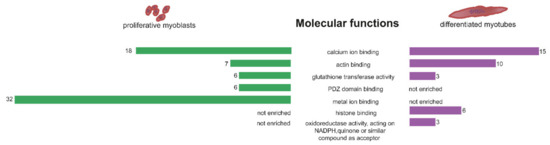 First, we were interested in the molecular functions of the differential expressed genes. DAVID GO molecular function enrichment analysis revealed that myoblasts and myotubes share enrichment of calcium (p-value 0.003 and 0.01) and actin binding (0.09 and 0.002) as well as glutathione transferase activity (0.00004 and 0.04) (Figure 2). Genes found in the calcium binding cluster represent sarcomeric proteins like actinin (ACTN4) or calcium homeostasis factors like ASPH, but mostly genes related to cell adhesion and the extracellular matrix vital for successful differentiation, development of the neuromuscular junction as well as wound healing and regeneration. This includes cadherines and protocadherines (CDH15, PCDH7/19), as well as glycoproteins such as agrin (AGRN) and proteoglycans (SPOCK1, HSPG2). Actin binding is more enriched in myotubes than in myoblasts which can be explained by increasing demands of the cellular morphology and the development towards sarcomeric structure. Consistently, genes of the spectrin–actin complex like SPTBN5 and ADD3 but also heavy myosin (MYH9) can be found in myotubes. Glutathione transferase activity is best known for its function in detoxification and response to reactive oxygen species. Here, several subunits of the glutathione S-transferase (GST) are differentially expressed in both myoblasts and myotubes. Further, molecular functions only enriched in myoblasts include PDZ domain binding, indicating a role in signalling pathways, and metal ion binding including genes like Na+/K+ ATPases (ATP1A2, ATP1A4) and RAS p21 protein activator (RASA4). In contrast, in DM1 myotubes there is an enrichment of histone binding genes like H4C11-15 as well as oxidoreductase activity highlighting possible changes in metabolism (Figure 2).