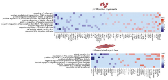 Heat maps showing differences in expression between DM1 and non-disease controls for the top enriched pathways based on GO-terms in proliferating myoblasts (upper panel) and differentiated myotubes (lower panel). Gene names displayed in grey: p-value < 0.1, in black: p-value < 0.05.