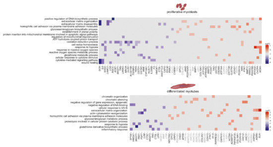 In myoblasts there are also pathways linked to mitochondria (protein insertion into mitochondrial membrane involved in apoptotic signal pathways, regulation of mitochondrial depolarization, ATP hydrolysis-coupled proton transport and the oxidation–reduction process), but also pathways linked to wound healing and cytokine-mediated signalling. In myotubes the top hits include chromatin organization and silencing, cellular response to UV-B, actin cytoskeleton organization and inflammatory response (Figure 4).