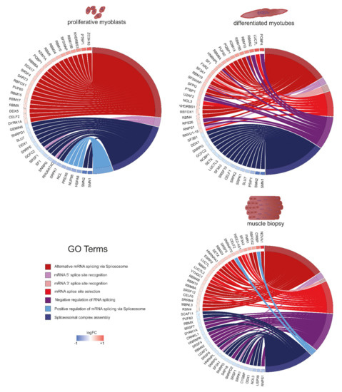 Missplicing is well described for DM1. We confirmed the presence of alternative splicing events in our tissue cultures on selected genes, including MBNL1 and TNNT2. LMO7 and TEAD1, both encoding transcription factors, are misspliced preferentially in myotubes respectively myoblasts (Figure S3). With the specific aim of investigating splicing alterations, we performed a test for gene set enrichment (GSEA) using the fgsea R package (results in Tables S4 and S5). Splicing and especially alternative splicing is a very sensitive process at the basis of gene expression regulation which has different outcomes depending on spliceosome assembly, splice site recognition and numerous other factors (reviewed in [61]). Consistently, it was shown that expression changes of only twofold of certain splicing factors such as SRSF1 can implicate strong effects on proliferation and apoptosis of more than twofold in cell culture [62]. We thus expect that small changes of a high number of splicing factors have broad implications, as spliceosome assembly and composition are affected. Accordingly, we analysed splicing associated genes with fold changes between 1.1 and 2/−1.1 and −2 to reveal if specific splicing pathways are affected in DM1 (Figure 5). Our data suggest that genes linked to alternative splicing via spliceosome, spliceosomal complex assembly, and mRNA 5′ splice site recognition are misregulated in both DM1 myoblasts and myotubes as well as adult muscle. Further, genes associated with positive regulation of mRNA splicing via spliceosome are downregulated in myoblasts, while in myotubes, pathways linked to mRNA splice site selection, mRNA 3′ splice site recognition, and negative regulation of RNA splicing are enriched. In muscle biopsies, we found all of these pathways affected. However, most striking was the clear cut-off between up- and downregulation. Pathways generally linked to constitutive splicing (complex assembly) are downregulated, while alternative splicing is upregulated. Notably, core components of the spliceosome machinery are underrepresented in our data and the muscle biopsy data; most splicing related genes belong to the category of accessory components important for recognition of specific splice sites rather than the splicing reaction itself. This might be a reason for the strong effects of DM1 on specific tissue types and transcripts rather than splicing in general. Members of the RNA-binding motif (RBM) family are upregulated in myoblasts, myotubes and adult muscle and play roles in alternative splicing via splice site selection. Interestingly, several studies have shown that, for example, RBM5 regulates the cell cycle and apoptosis while RBM24 is important for striated muscle differentiation, thus integrating well in our analysis so far [63,64]. Survival motor neurons 1 and 2 (SMN1/2) are downregulated in both proliferating and differentiated muscle cells twofold. Deficiency of SMN1/2 is usually associated with spinal muscular atrophy; however, it was shown that low levels influence muscle differentiation and maturation through the AKT signalling pathway [65]. Similar involvements in proliferation, apoptosis and differentiation are known for many of the genes displayed in Figure 5.