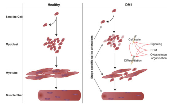 There is a plethora of data sets regarding missplicing in DM1, yet, it remains elusive which other pathomechanisms may contribute to this complex disease and how they might interconnect. We investigated gene expression in a tissue culture differentiation system using primary human myoblasts collected from DM1 patients and non-disease controls. This is highly promising in providing insight concerning the development of novel treatments and helps to answer the question of whether it will be sufficient to target mature muscle, or if it will be necessary to aim for satellite cells as well.