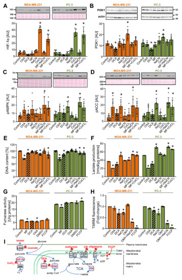 DCA reduces the abundance of PDK1 in MDA-MB-231 and PC-3 cancer cells. (A–G) Cells were treated with 10 mM oxamate (OXA), 10 mM DCA, 5 mM metformin (MF), 5 mM NaCN, 250 μM CoCl2, metformin + NaCN or metformin + CoCl2, or 0.5 μM FCCP or dimethyl sulfoxide (DMSO) for 24 h in RPMI medium without FBS (A–D,F) or with 10% FBS (E,G). Immunoblotting was used to evaluate the protein levels of (A) HIF-1α, (B) PDK1 and β-actin, (C) phospho-AMPKαThr172 (pAMPK), and (D) phospho-ACCSer79 (pACC). Total protein loading was evaluated by staining with Ponceau S (shown below the blots). Numbers next to the blots and Ponceau stains indicate molecular weight markers in kDa. (E) The total DNA content was estimated by Hoechst 33342 staining. (A–E) Results are means ± SD of two experiments in triplicate for each cell line (n = 6). (F) Lactate production in 24 h. Results are means ± SD of one experiment in triplicate (n = 3). (G) Activity of fumarase (fumarate hydratase). Results are means ± SD of one experiment in duplicate (n = 2). (H) MDA-MB-231 and PC-3 cancer cells were treated for 40 min with 10 mM oxamate (OXA), 10 mM DCA, 10 mM NaCN, 5 μM oligomycin (OMY), OMY + NaCN, or 40 μM FCCP in PBS with 1 g/L glucose 10 mM HEPES, 2 mM glutamine, and 1% FBS. Mitochondrial membrane potential was determined using TMRM. Results are means ± SD of three independent experiments (n = 3). (I) Site of action of compounds used in these experiments. Abbreviations: CI–V: mitochondrial complexes I–V, FH: fumarate hydratase (fumarase), PDC: pyruvate dehydrogenase complex, PDK: pyruvate dehydrogenase kinase, LDH: lactate dehydrogenase, 26S: the 26S proteasome, OMY: oligomycin; TCA: the tricarboxylic acid (Krebs) cycle. * p < 0.05 vs. Control.