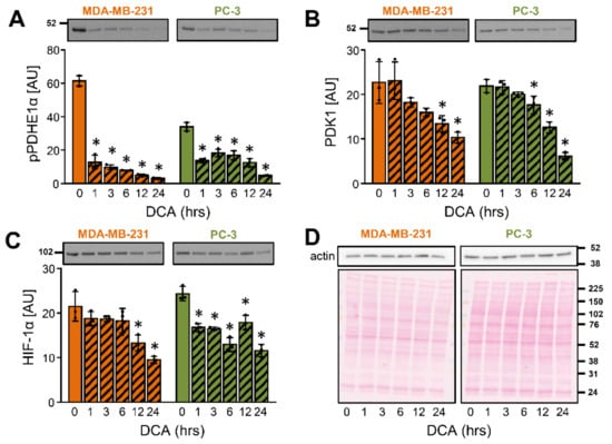 Time-dependent effects of DCA on the PDK1 and HIF-1α in MDA-MB-231 and PC-3 cancer cells. (A–D) Cells were treated with 10 mM DCA in serum-free RPMI medium for 24 h. Protein levels of (A) phospho-PDHE1αSer293 (pPDHE1α), (B) PDK1, (C) HIF-1α, and (D) β-actin were determined with immunoblotting. (D) Ponceau S staining was used for the assessment of protein loading. Numbers next to the blots and Ponceau stains indicate molecular weight markers in kDa. Results are means ± SD of one experiment performed in triplicate for each cell line (n = 3). * p < 0.05 vs. 0 h.