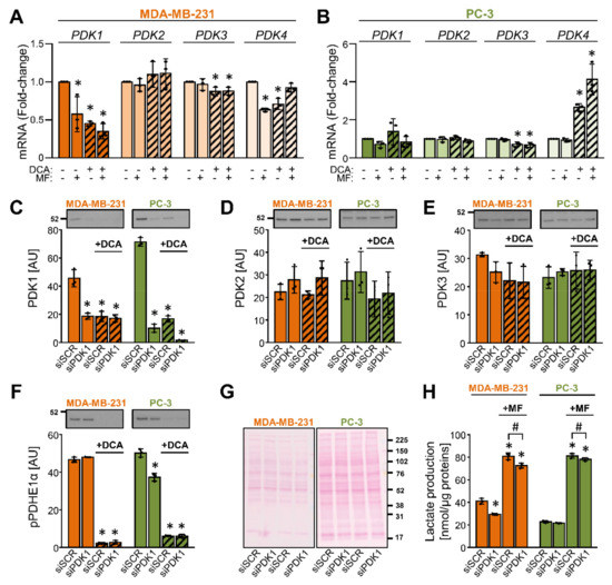 DCA reduces the abundance of PDK1 in MDA-MB-231 and PC-3 cells. (A,B) Cancer cells were treated with 10 mM DCA and/or 5 mM metformin (MF) in serum-free RPMI medium for 24 h. The mRNA expression of PDK1–4 isoenzymes was evaluated in (A) MDA-MB-231 and (B) PC-3 cells with qPCR (endogenous control: cyclophilin). (C–F) After treating MDA-MB-231 and PC-3 cells with the PDK1 siRNA (siPDK1) or the scrambled siRNA (siSCR), cells were exposed to 10 mM DCA for 24 h in serum-free RPMI medium. Immunoblotting was used to evaluate the protein levels of (C) PDK1, (D) PDK2, (E) PDK3, and (F) phospho-PDHE1αSer293 (pPDHE1α). (G) Ponceau S staining was used to evaluate the total protein loading. Numbers next to the blots and Ponceau stains indicate molecular weight markers in kDa. (H) Lactate production in PDK1-deficient (siPDK1) and control (siSCR) cells treated with 5 mM metformin (MF) for 24 h. Results are means ± SD of one experiment performed in triplicate for each cell line (n = 3). * p < 0.05 vs. untreated cells (A,B) or siSCR (C–F,H) and # p < 0.05 as indicated.