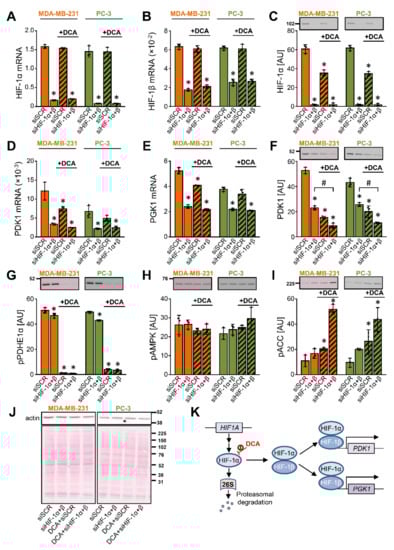 The suppression of PDK1 by DCA is partially independent of the transcriptional control via HIF-1α. (A–J) MDA-MB-231 and PC-3 cells were transfected with siRNAs against HIF-1α and HIF-1β to produce a double knock-down (siHIF-1α + β). They were subsequently treated with 10 mM DCA for 24 h in serum-free RPMI medium. The mRNA expression of (A) HIF-1α, (B) HIF-1β, (D) PDK1, and (E) PGK1 was estimated by qPCR (endogenous control: cyclophilin). The protein levels of (C) HIF-1α, (F) PDK1, (G) phospho-PDHE1αSer293 (pPDHE1α), (H) phospho-AMPKαThr172 (pAMPK), (I) phospho-ACCSer79 (pACC), and (J) β-actin were determined with immunoblotting. (J) Protein loading was evaluated by the Ponceau S staining. Numbers next to the blots and Ponceau stains indicate molecular weight markers in kDa. (K) Schematic representation of regulation of gene expression by HIF-1. Results are means ± SD of one experiment performed in triplicate for each cell line (n = 3). * p < 0.05 vs. siSCR and # p < 0.05 as indicated.