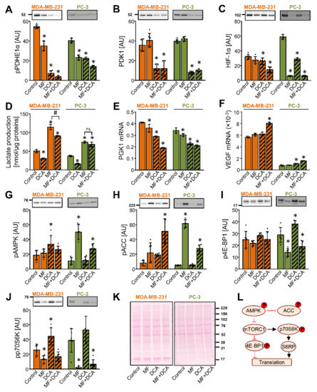 Inhibition of the mTOR pathway does not contribute to the DCA-induced suppression of PDK1. (A–K) MDA-MB-231 and PC-3 cells were treated with 5 mM metformin (MF), 10 mM DCA, or both in serum-free RPMI medium for 24 h. The protein level of (A) phospho-PDHE1αSer293 (pPDHE1α), (B) PDK1, (C) HIF-1α, (G) phospho-AMPKαThr172 (pAMPK), (H) phospho-ACCSer79 (pACC), (I) phospho-4E-BP1Thr 37/46 (p4E-BP1), and (J) phospho-p70S6KThr389 was determined with immunoblotting. (K) Total protein loading was evaluated with the Ponceau S staining. Numbers next to the blots and Ponceau stains indicate molecular weight markers in kDa. Results are means ± SD of two experiments performed in triplicate (n = 6). * p < 0.05 vs. Control. (D) Lactate production in MDA-MB-231 and PC-3 cells treated with 10 mM DCA and/or 5 mM metformin for 24 h. The mRNA expression of (E) PGK1 and (F) VEGF was measured with qPCR (endogenous control: cyclophilin). (D–F) Results are means ± SD of one experiment performed in triplicate for each cell line (n = 3). * p < 0.05 vs. Control and # p < 0.05 as indicated (L) Schematic overview of the AMPK and mTOR signaling. Phosphoproteins that were evaluated in this study are indicated with P in a red circle. S6RP: S6 ribosomal protein. For other abbreviations, see the text.