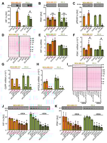 Inhibition of the proteasome or mitochondrial proteases does not prevent the DCA-induced suppression of PDK1 in MDA-MB-231 and PC-3 cells. (A–F) Cells were treated with DCA (10 mM) for 12 h in serum-free RPMI medium. MG-132 (10 μM, MG) was added during the final 6 h. (G–K) Cells were transfected with 20 nM scrambled siRNA (siSCR) or 10 nM CLPP and/or AFG3L2 siRNA (siCLPP and siAFG3L2). (G,H) Gene expression was assessed 48 h after the transfection. (J,K) Cells deficient in CLPP (siCLPP) and/or AFG3L2 (siAFG3L2) and control (siSCR) cells were treated with 10 mM DCA in serum-free RPMI medium for 24 h. The mRNA expression of (E) HIF-1α, (F) PDK1, (G) CLPP, and (H) AFG3L2 was estimated with qPCR (endogenous control: cyclophilin). The abundance of (A,J) HIF-1α, (B,K) PDK1, (C) phospho-PDHE1αSer293 (pPDHE1α), and (I) β-actin was determined with immunoblotting. (D,I) Protein loading was evaluated with the Ponceau S staining. Numbers next to the blots and Ponceau stains indicate molecular weight markers in kDa. Results are means ± SD of one experiment, performed in triplicate, for each cell line and condition (n = 3). * p < 0.05 vs. Control or siSCR and # p < 0.05 as indicated.