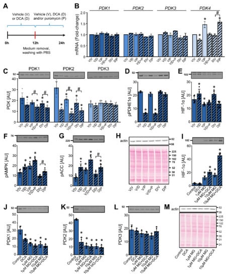 PDK1 is also regulated by HIF-1α in skeletal muscle, where it seems to play an important role in the adaptation to exercise or hypoxia [27,69]. We therefore assessed whether effects of DCA on PDK1 in the differentiated L6 skeletal muscle cells (myotubes) mimic those in cancer cells. L6 myotubes were treated with 10 mM DCA for 12 h, which was followed by a 12-h treatment with DCA (10 mM) and/or puromycin (0.5 μg/mL) (Figure 7A), an inhibitor of the translation.