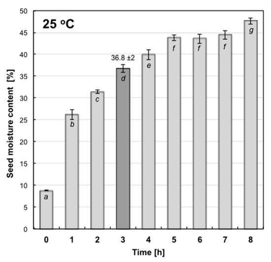 In the former case, attention should be paid to homogeneous access of seeds to water amount given, calculated for their specific portion (weight) [43]. A limited amount of seeds (small portions) could be used in this technique and hydropriming should be carried out in rotating containers. Unfortunately, angular seeds, as dry corn, can be injured during rotations-as was observed in our preliminary experiments. In the latter case, when an unlimited quantity of water is used, the time of soaking to obtain experimentally established final seed moisture content should be precisely determined. In this case kinetics of imbibition at optimal temperature 25 °C was determined (Figure 1). It was shown that 3 h of corn seed soaking at 25 °C was sufficient to obtain 36.77% ± 2 of moisture content, thus hydropriming was done as follows: portions of 200 g of corn seeds were placed in plastic containers with 200 mL of oxygenated, distilled water or MEL water solutions (depending on the experimental variant) and incubated for 3 h at 25 °C. Then, the seeds were air-dried at room temperature for the subsequent 3 days (to let them return to the initial water content) and used in tests.