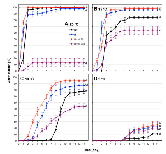 Further lowering the temperature to 10 °C prolonged the lag phase to 6-7 days in NT seeds and reduced their germination to 77% (Figure 2C). In contrast, the conditioned seeds started to germinate on the 3rd day (H and HMel 500) and even on the 2ed in the case of HMel 50. The obtained results were 87%, 95% and 54% for H, HMel 50 and HMel 500, respectively (Figure 2C).