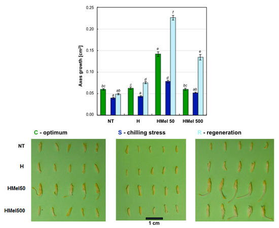 Effect of different maize seed hydropriming treatments on growth of the axes isolated from the non-treated seeds (NT), and those from hydroprimed with water (H) and with MEL water solutions in concentrations: 50 μM (HMel 50) and 500 μM (HMel 500). The seeds were imbibed/germinated in water at 5 °C in darkness for 14 days (S [■]—chilling stress), and subsequently regenerated at 25 °C for 1 day (R [■]—regeneration). Growth was also estimated in axes isolated from the seeds germinated for 24 h under optimal conditions 25 °C (C [■]—optimum, control conditions). The results presented on graph are expressed as means of 20–40 measurements ±SEM. Two-way ANOVA and Duncan’s post-hoc tests were performed. The lowercase letters next to the values show statistical significance at the specified p. The results are also presented as a photo panel. GROWTH—ANOVA results: Seed Variant (NT,H,HMel 50,HMel 500) F(3;348) = 368.9, p < 0.000001; Conditions (C,S,R) F(2;348) = 267.4, p < 0.000001; interaction Seed Variant × Conditions F(6;348) = 67.2, p < 0.000001.