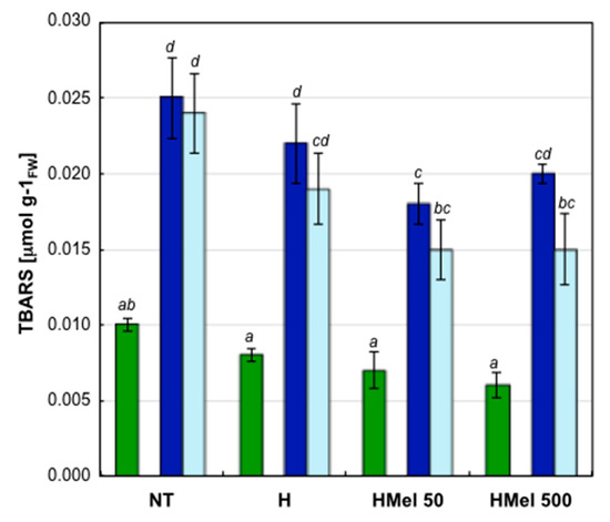 Effect of different maize seed hydropriming treatments on TBARS accumulation in the axes isolated from the non-treated seeds (NT), and those from hydroprimed with water (H) and with melatonin water solutions in concentrations: 50 μM (HMel 50) and 500 μM (HMel 500). The seeds were imbibed/germinated in water at 5 °C in darkness for 14 days (S [■]—chilling stress), and subsequently regenerated at 25 °C for 1 day (R [■]—regeneration). TBARS were also estimated in axes isolated from the seeds germinated for 24 h under optimal conditions 25 °C (C [■]—optimum, control conditions). The results are expressed as means of 6–9 measurements ±SEM. Two-way ANOVA and Duncan’s post-hoc tests were performed. The lowercase letters next to the values show statistical significance at the specified p. TBARS—ANOVA results: Seed Variant (NT,H,HMel 50,HMel 500) F(3;84) = 6.57, p < 0.000001; Conditions (C,S,R) F(2;84) = 44.07, p < 0.000001; interaction Seed Variant × Conditions F(6;84) = 0.80, p = 0.57 no statistical significance.