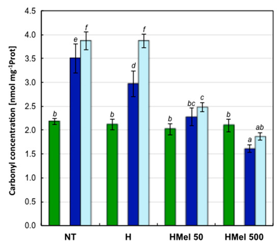 The degree of protein carbonylation in embryonic axes of the seeds germinating under optimal conditions was also similar (Figure 5). The 14-day chilling stress (S) strongly increased the concentration of carbonyl groups in the proteins extracted from NT seed embryos and to a lesser extent from H seed embryos (Figure 5). Unfortunately, the upward trend of this parameter was maintained in the above seed variants even after the stress relief during regeneration (R) (Figure 5). In contrast, in embryos of HMel 50 seeds an insignificant increase in protein carbonylation was observed under chilling stress and after its removal and in the case of HMel 500 even decrease in this parameter (Figure 5). In both cases, the actual reduction of oxidative modifications/damages to proteins probably due to MEL applied to the seeds can be postulated.