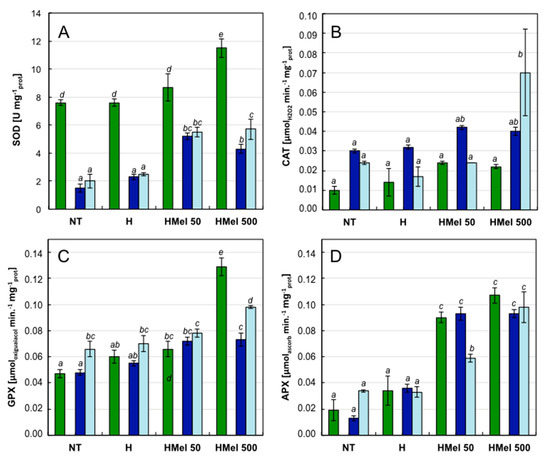 Smaller oxidative damages observed were correlated with a better functioning of the antioxidant enzyme system. Even under optimal conditions, SOD showed higher activity in the HMel 50 and in particular HMel 500 seed embryos (Figure 6A). Chilling significantly reduced SOD activity in the embryonic axes of NT and H seeds and did not increase even after their regeneration at optimal conditions. In the axes of seeds treated with MEL, cold also decreased SOD activity, but only by 1/3 of the control value. Moreover, both in stress and after regeneration, it remained about twice as high as in NT and H seeds (Figure 6A).