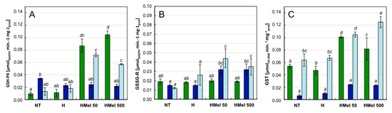 Effect of different corn seed hydropriming treatments on the glutathione-dependent detoxification enzymes activities: GSH-PX (A), GSSG-R (B), and GST (C) in the axes isolated from non-treated seeds (NT), and those from hydroprimed with water (H) and with melatonin water solutions in concentrations: 50 μM (HMel 50) and 500 μM (HMel 500). The seeds were imbibed/germinated in water at 5 °C in darkness for 14 days (S [■]—chilling stress), and subsequently regenerated at 25 °C for 1 day (R [■]—regeneration). Enzyme activities were also estimated in axes isolated from the seeds germinated for 24 h under optimal conditions 25 °C (C [■]—optimum, control conditions). The results are expressed as means of 6–9 measurements ±SEM. Two-way ANOVA and Duncan’s post-hoc tests were performed. The lowercase letters next to the values show statistical significance at the specified p. GSH-PX—ANOVA results: Seed Variant (NT,H,HMel 50,HMel 500) F(3;81) = 33.27, p < 0.000001; Conditions (C,S,R) F(2;81) = 13.06, p < 0.000001; interaction Seed Variant × Conditions F(6;81) = 14.62, p < 0.000001. GSSG-R—ANOVA results: Seed Variant (NT,H,HMel 50,HMel 500) F(3;118) = 8.52, p < 0.0001; Conditions (C,S,R) F(2;118) = 5.68, p < 0.005; interaction Seed Variant × Conditions F(6;118) = 2.60, p < 0.01. GST—ANOVA results: Seed Variant (NT,H,HMel 50,HMel 500) F(3;77) = 24.61, p < 0.000001; Conditions (C,S,R) F(3;77) = 24.61, p < 0.000001; interaction Seed Variant × Conditions F(6;77) = 3.79, p < 0.005.