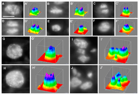 Micrographs (A–J) and their digital transformations (A’–J’), of nuclei from Zea mays axes basic zone cells fixed in Carnoy’s and stained with DAPI showing: prophase (A,A’), metaphase (B,B’), anaphase (C,C’) and telophase (D,D’), nucleus during under the G1 (E,E’) and under the G2 (F,F’) phases and nuclei in endocycle, i.e., endo S with 6C (G,G’) and with 8C DNA (H,H’) as well as nuclei fragmentation (I,I’), (J,J’). Scale bar is 10 μm (A). The photos and digital transformations represent cells from NT seeds germinated at optimal temperature (Control): (A,A’), (B,B’), (C,C’), (D,D’) and (F,F’); from hydroconditioned H seeds germinated at optimal temperature (Control): (E,E’); from HMel 50 seeds after regeneration phase (R): (G,G’) and (H, H’); from hydroconditioned H seeds after regeneration phase (R): (I,I’) and (J,J’).
