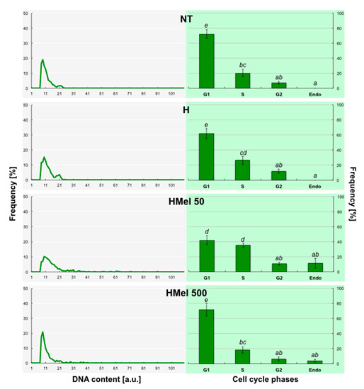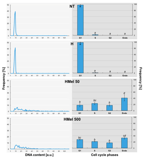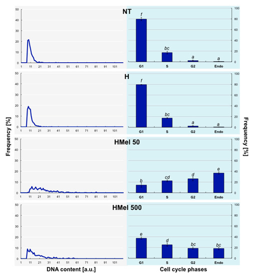 The histograms received for seeds germinated at 5 °C (Figure 10) revealed that the proliferation process was disturbed by chilling (S). In NT and H seed variants, cells were mostly stopped in G1 phase, and relatively few cells were observed in other cycle phases. As we supposed, the largest number of endoreplicating cells (about 40% cell nuclei in HMel 50 and 20% in HMel 500) appeared in MEL-treated seeds.