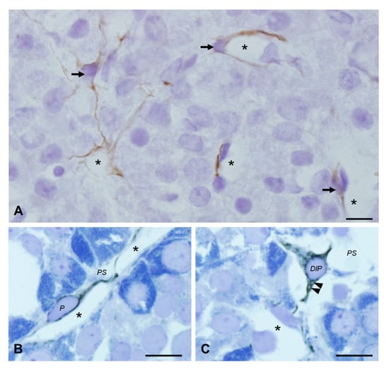 Five mixed types of hormone-producing cells in the anterior pituitary gland assemble in clumps and cords, forming cluster structures [,]. Generally, each cell group is surrounded by a parenchymal basement membrane that separates hormone-cell clusters from the perivascular space and capillaries. In addition to hormone-producing cells, there are other cell types that do not produce hormones in the gland, i.e., folliculostellate cells, capsular fibroblasts, macrophages, endothelial cells, and pericytes. In 2012, we succeeded in identifying a new cell type in the perivascular space using desmin immunoelectron microscopy; namely, novel desmin-immunopositive perivascular (DIP) cells []. However, the differences in morphology and characteristics between this novel DIP cell and other nonhormone-producing cells have not been compared and elucidated.