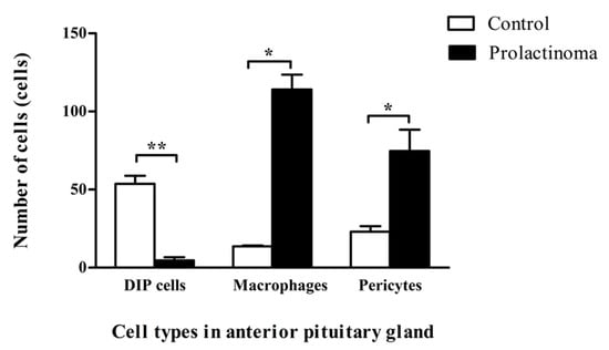 Number of cells in the perivascular space of anterior pituitary glands in control (n = 3 rats) and prolactinoma rats (n = 3 rats). Values are the mean ± SEM. Desmin-immunopositive perivascular (DIP) cells, ** p < 0.001; macrophages, * p < 0.005; and pericytes, * p < 0.005.