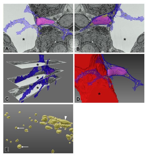In the last decade, the 3D reconstruction of tomography imaging has been useful to clarify the accurate morphology of fine structures inside cells and has tended to increase the number of publications in this field [,,,,]. We introduced FIB-SEM, a new scanning electron microscopic technique, to investigate the entire cell shape, including organelles, of novel DIP cells. Instead of conventional manual ultramicrotome sectioning, FIB-SEM rapidly provides stacks of transmission electron-like micrographs using an automatic milling-scanning system. The FIB-SEM system works with the same resin blocks as a conventional transmission electron microscopy and is also able to apply a metal coating on the surface of the blocks. Therefore, it is useful for histologists who would like to enter the 3D biological field. In this study, tomography showed the differences in cell shapes when observing the image stack, and we could not gain these data from a single capture of 2D conventional transmission electron micrographs. Yoshitomi et al. (2016) reported that a number of pituitary hormone cells were arranged close to the vessel wall to facilitate hormone secretion []. This finding supports our hypothesis that novel DIP cells might communicate or associate with capillaries, as they also reached the processes and wrapped around the capillary. Moreover, our study is the first report of the ball-like structure and short anastomosis of rERs in vivo using 3D reconstruction technology (Figure 6 and Supplemental Video S1).