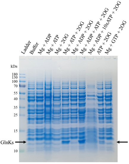 SDS-PAGE of the membrane release experiment with different added ligands. Arrows indicate the position of MtGlnKs on the gel.