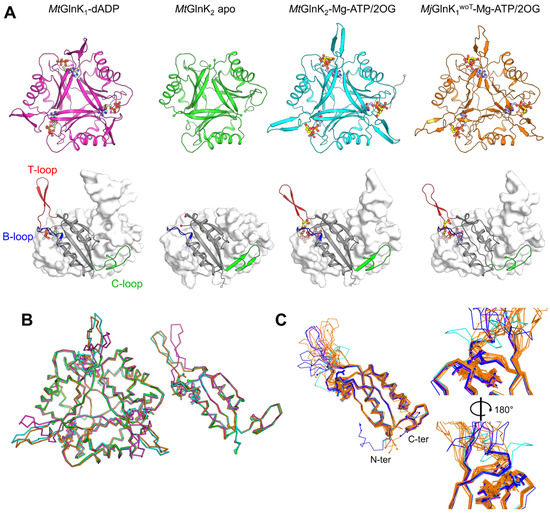 All obtained structures exhibit the typical trimeric organization and typical fold of the PII-family in which β-sheets organize the trigonal core while the α-helices are located at the periphery (Figure 2A, Figure S5), as described in other work [14,24]. The three main loops, T- (residues 36–55), B- (residues 82–89) and C- (residues 102–112) were identified based on their high structural similitude with the GlnK homologue from A. fulgidus (Figure 2A). The N-terminal His-tag is only partially observable in the MtGlnK2-Mg-ATP/2OG structure and appears to be highly flexible, without interfering with the ligand binding site.