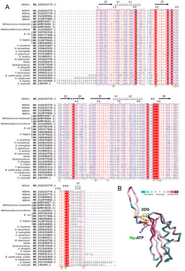 Sequence conservation among structurally characterized PII members with the addition of various Methanococcales (see Supplemental materials for the full names). (A) Sequences were aligned with Clustal omega and processed with Espript 3.0. MtGlnK1 was used as a reference for the secondary structure. Dots indicate residues involved in ligand binding via side chain (green) or main chain (orange). Green stars indicate a C-terminal extension (Q-loop). (B) Sequence conservation score superposed on the 3D-structure of MtGlnK2-Mg-ATP/2OG monomer processed via the ConSurf Server [25,26]. The conservation is represented as a color gradient, from blue (variable) to dark red (conserved). Nitrogen, oxygen, phosphorus and Mg are colored in blue, red, orange and green, respectively. Carbons of 2OG and ATP are colored yellow and pale blue, respectively.