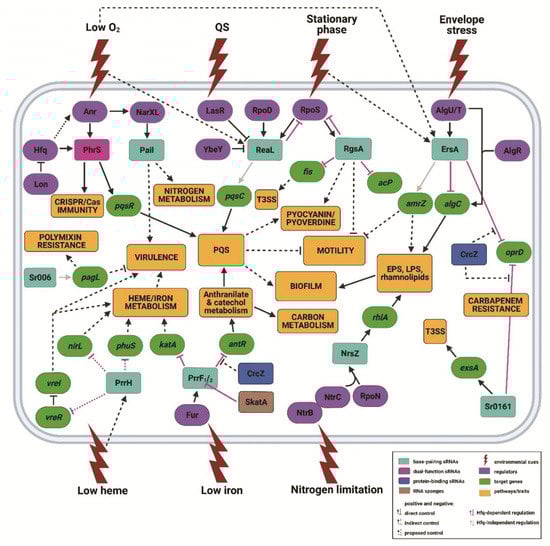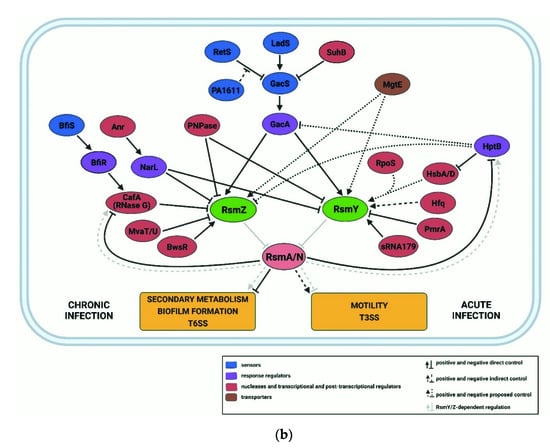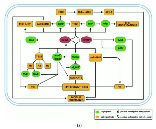 Pae features two comprehensive post-transcriptional networks, which are governed by Hfq/Crc [,] and the CsrA-like Rsm proteins [,], respectively, and their antagonizing RNAs (Figure 2).